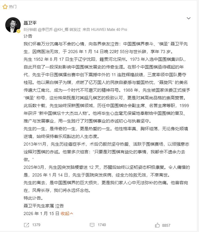 11 月 14 日晚上,中国围棋协会名誉主席、“棋圣” 聂卫平九段在北京病逝,享年 74 岁。他女儿聂云菲社交平台账号个性签名改为 “老爸,记得常到梦里回来看看我”,并发布动态:“明明已经恢复那么好了,为什么上天这样无情,为何人生如此无常,子欲养而亲不待…………”